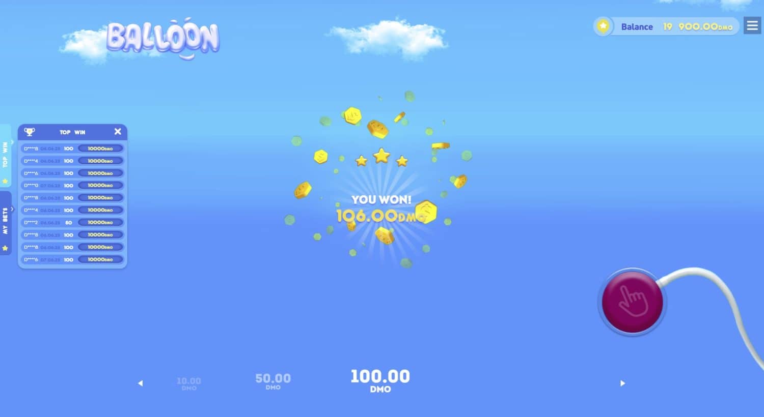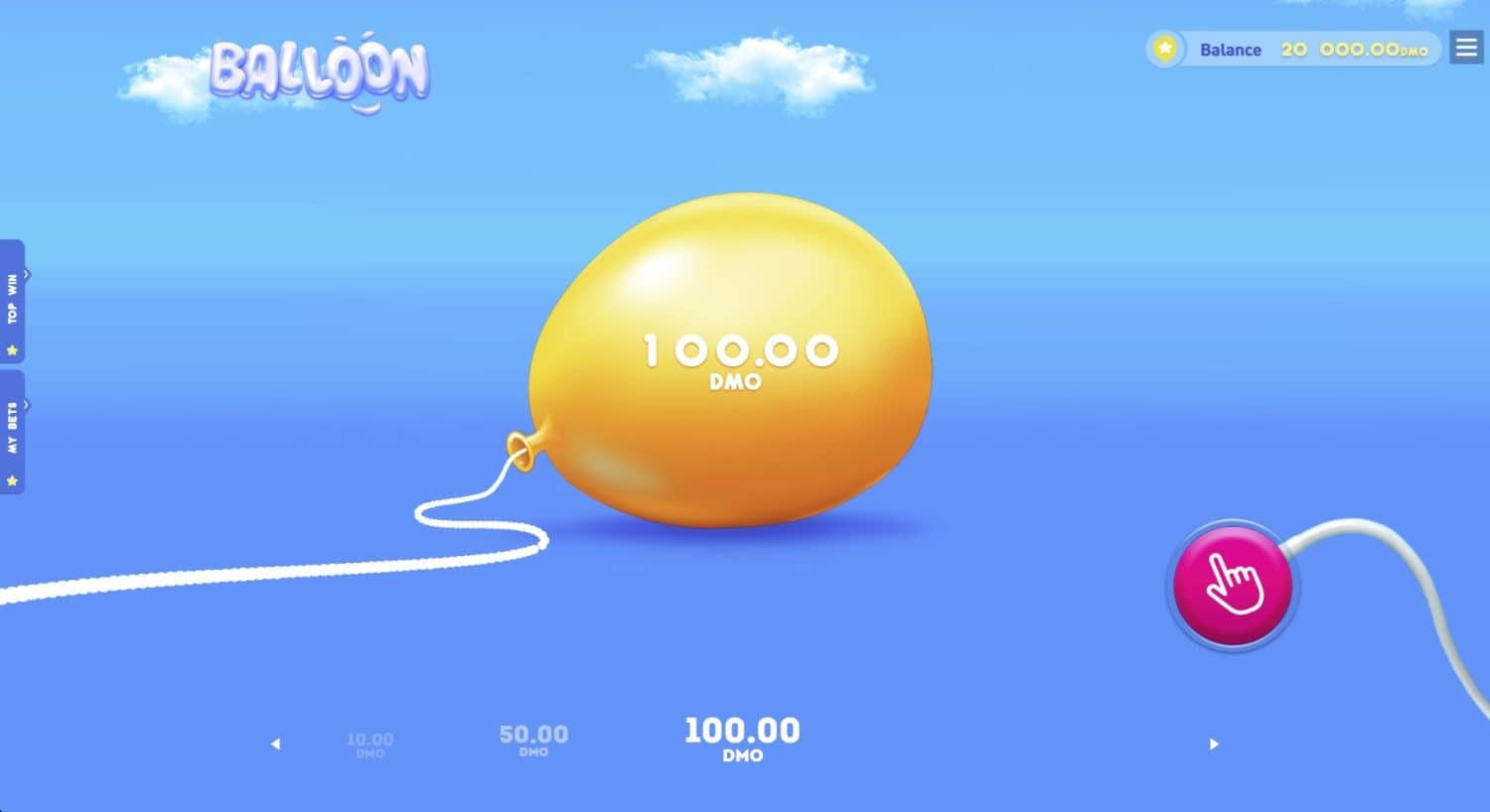 Der RTP von Balloon Game schwankt je nach Version zwischen 95% und 98%. Im Durchschnitt platzt 1 von 5-7 Ballons vor x2 (zu testen im Demo-Modus).